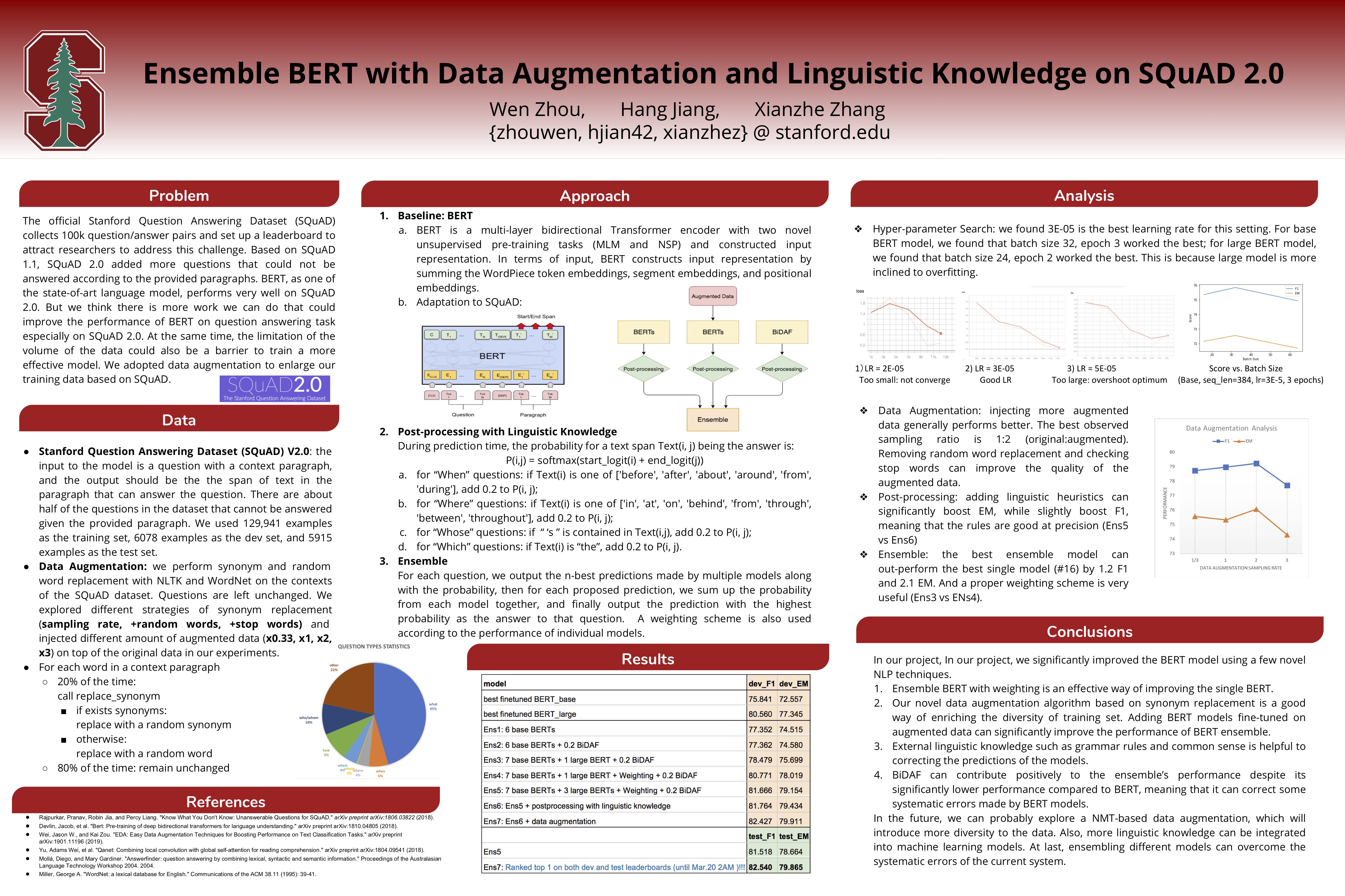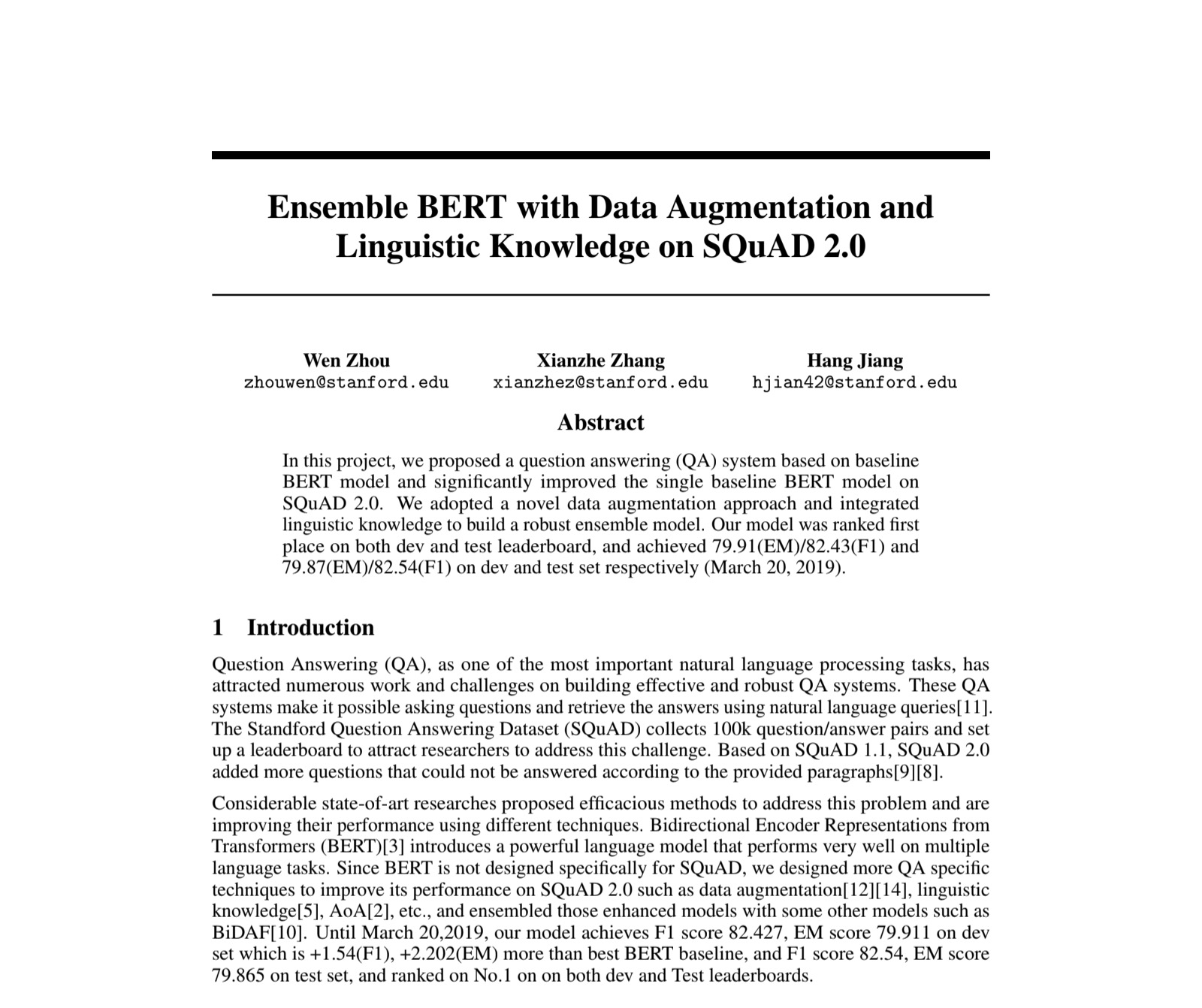 We proposed a question answering (QA) system based on baseline BERT model and obtained better result than single baseline BERT model on SQuAD 2.0. We tried multiple methods, adopted data-augmentation, post-processing with linguistic knowledge, and built an ensemble model.